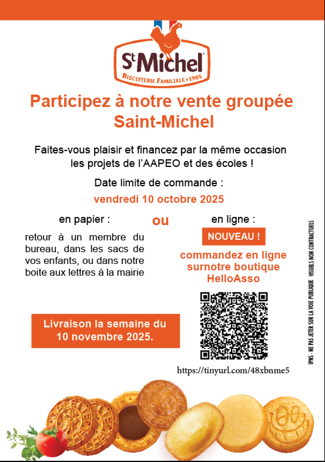 01/10/2025 : Vente groupée Saint Michel 31/10/2025 : Halloween 09/11/2025 09:00:00: La malle aux trésors – Bourse aux jouets, vêtement et puériculture 14/12/2025 : Noël 01/01/2026 : Tombola Galettes 08/03/2026 : Carnaval 26/04/2026 : Chasse aux œufs 27/06/2026 : Kermesse